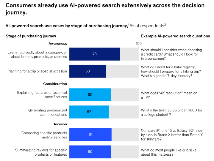 More than 70% of consumers using AI-driven search engage with it at the top of the funnel seeking to learn about a category, brand, product, or service. Yet, the influence of AI doesn’t stop there. These intelligent search tools are now deeply embedded throughout the entire consumer decision journey, shaping choices from initial discovery to final purchase.